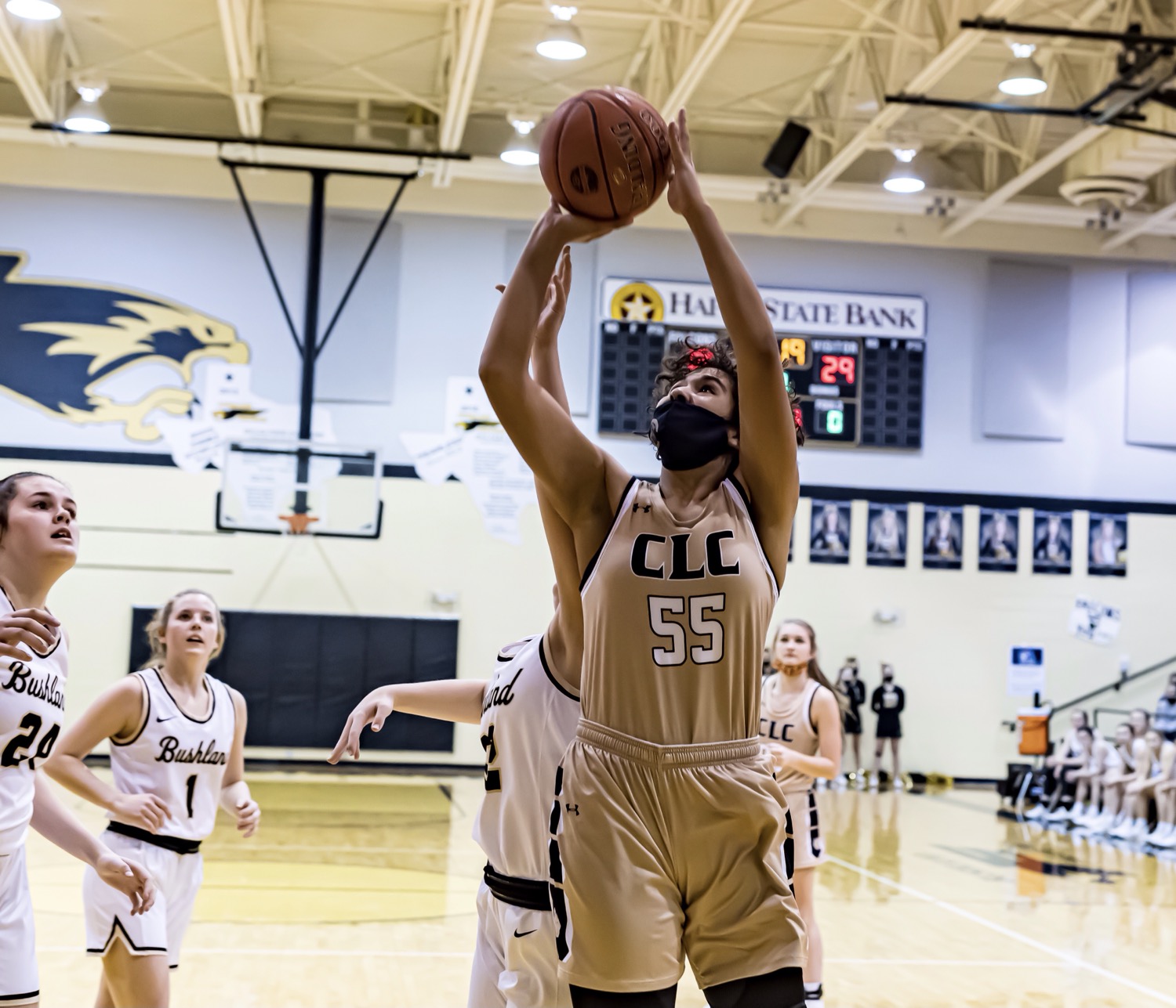 Canadian’s Mattie Boyd (55) goes up for a score against Bushland during a District 1-3A clash at the Falcons Gym on Tuesday night. [Tom Carver/ Press Pass Sports]