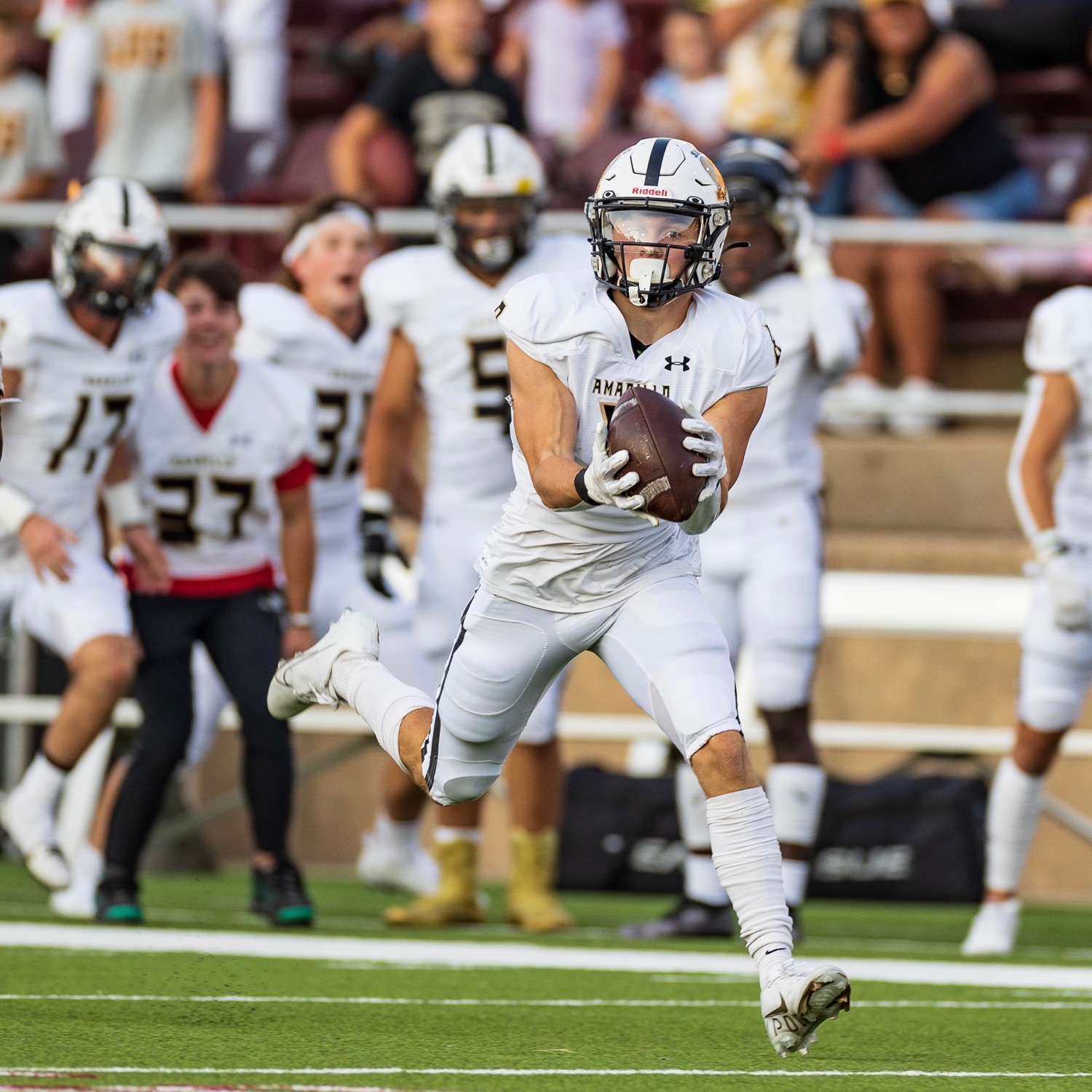 Amarillo High wide receiver Jameson Garcia hauls in a catch against Randall at Happy State Bank Stadium on Friday night. [Tom Carver/ Press Pass Sports]
