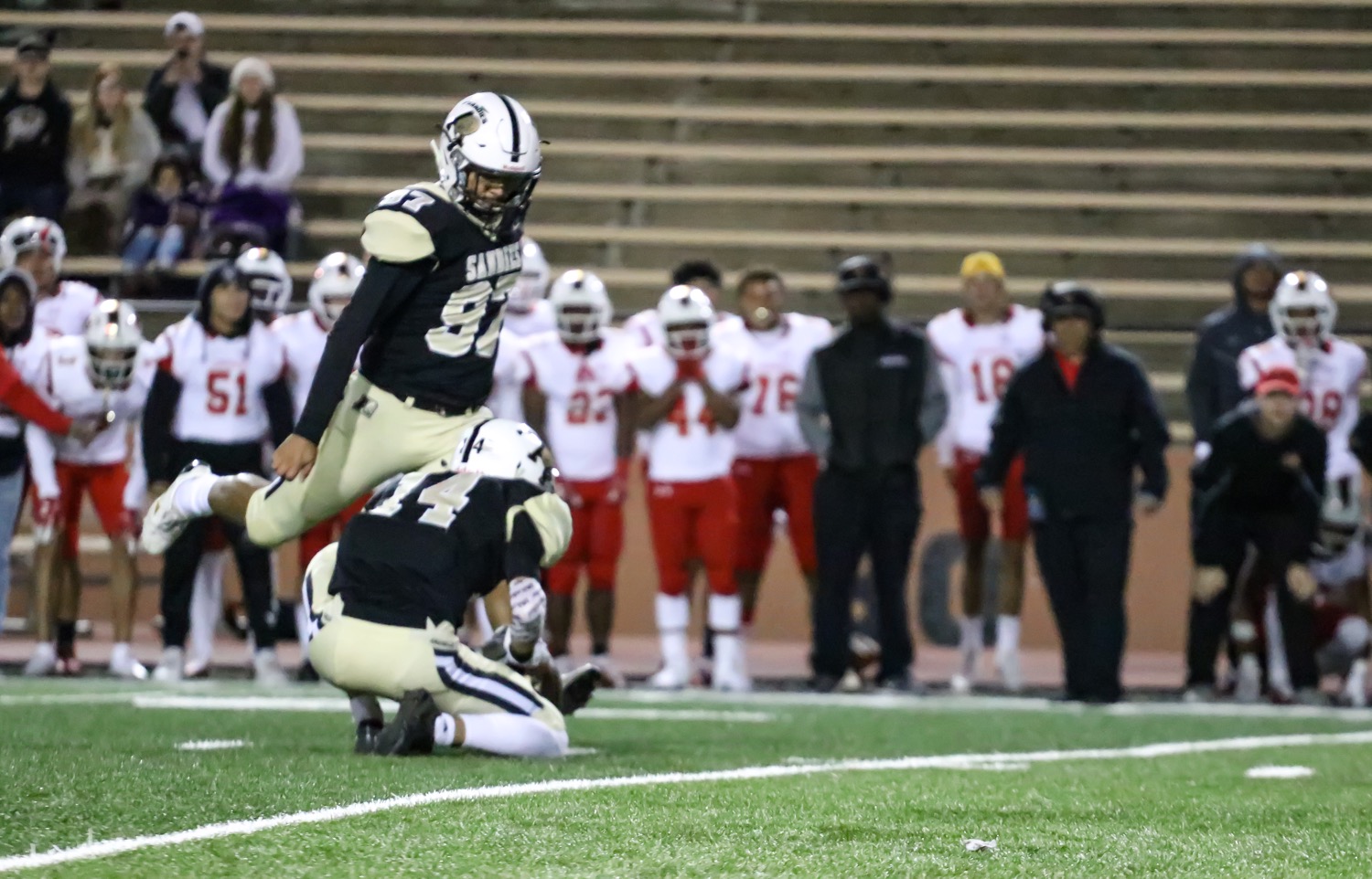 Amarillo High kicker A.J. Villar kicks a game-winning 36-yard field goal as time expires to send the Sandies past Lubbock Coronado 31-28 on Friday night at Dick Bivins Stadium. [Ben Jenkins/ Press Pass Sports]
