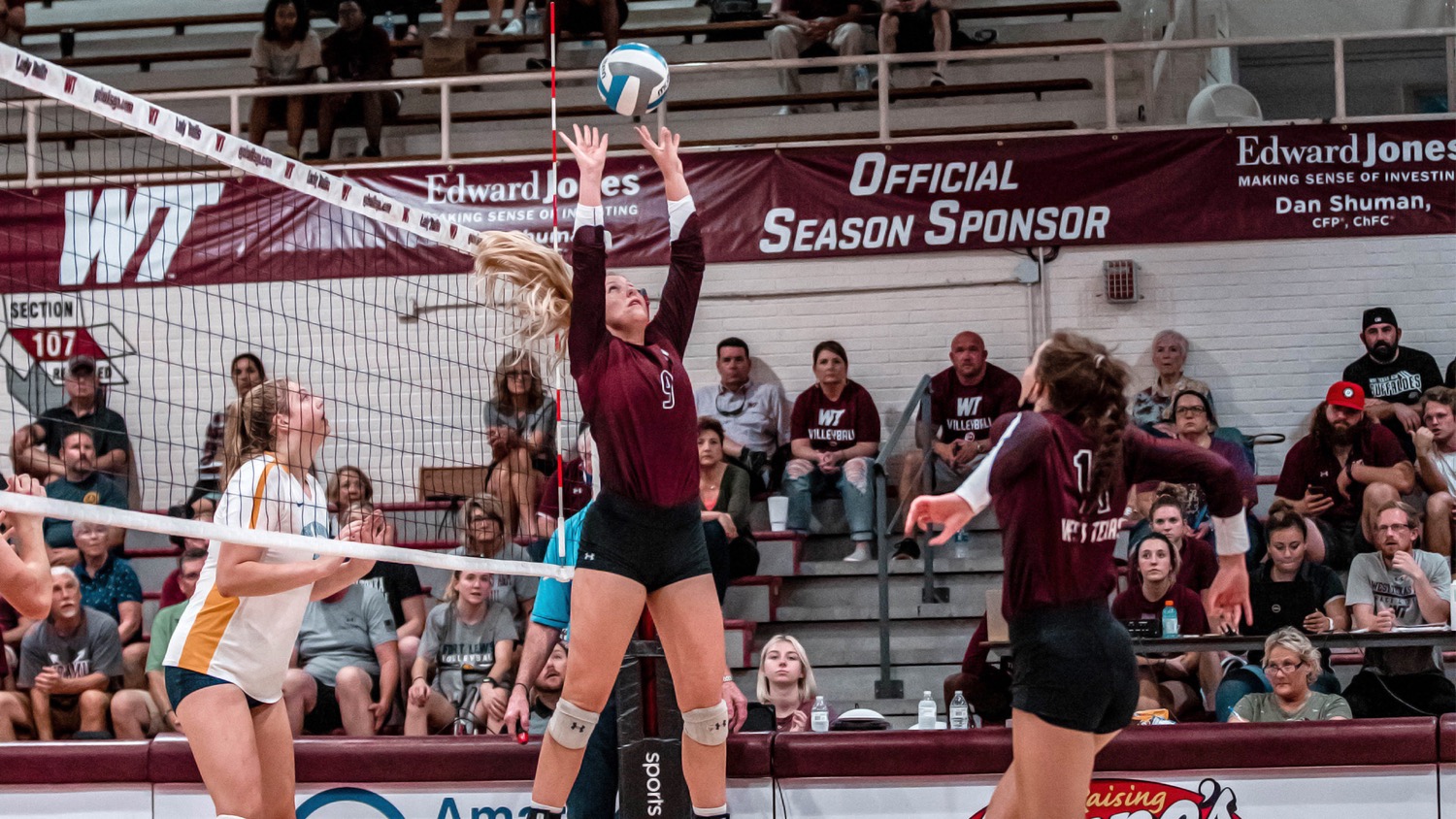 West Texas A&M’s Sadie Snay sets a hitter during a Lone Star Conference match against Eastern New Mexico on Wednesday. [Trevor Fleeman/ WT athletics]