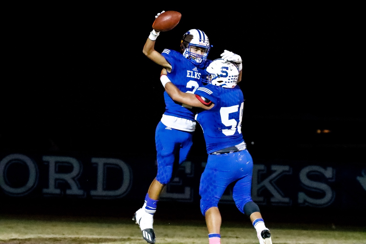Stratford’s Dru Jones left, celebrates with teammate Anthony Gonzales after a touchdown during the Elks District 3-2A clash with Gruver at E.L. Sam Bass Stadium on Friday. [Ben Jenkins/ Press Pass Sports]