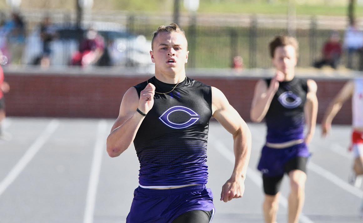 Canyon’s Rafe Butcher sprints down the track during Thursday’s District 4-4A Track and Field Meet in Borger. [Tucker Stroud/ Press Pass Sports]
