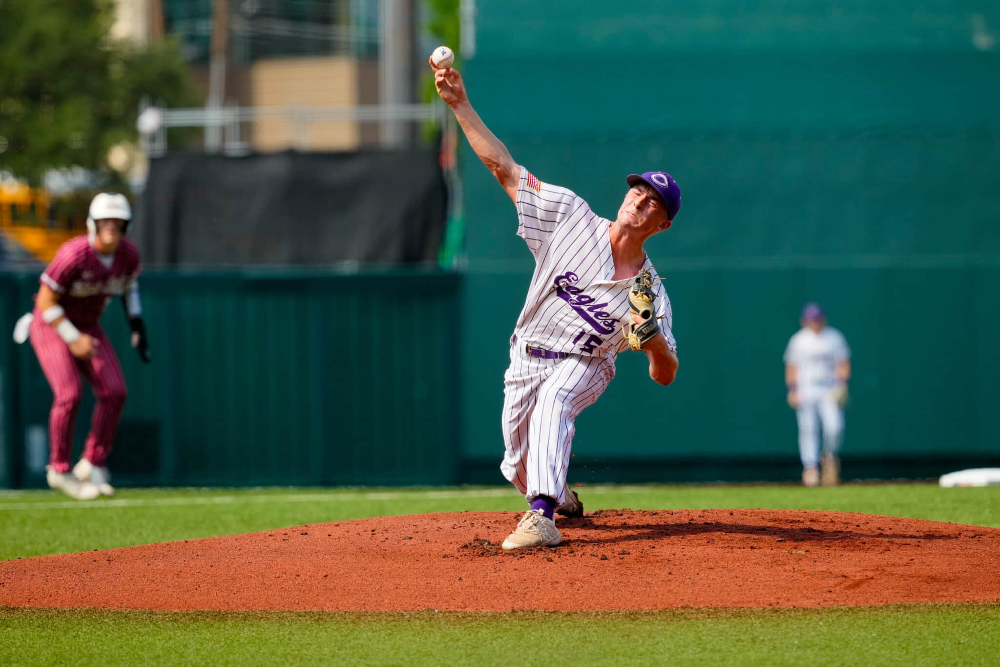 Christian McGuire of Canyon makes a throw to first base during the Eagles UIL Class 4A state semifinal against Texarkana Liberty-Eylau at Austin’s Disch-Falk Field. [Alex Garza/ For Press Pass Sports]