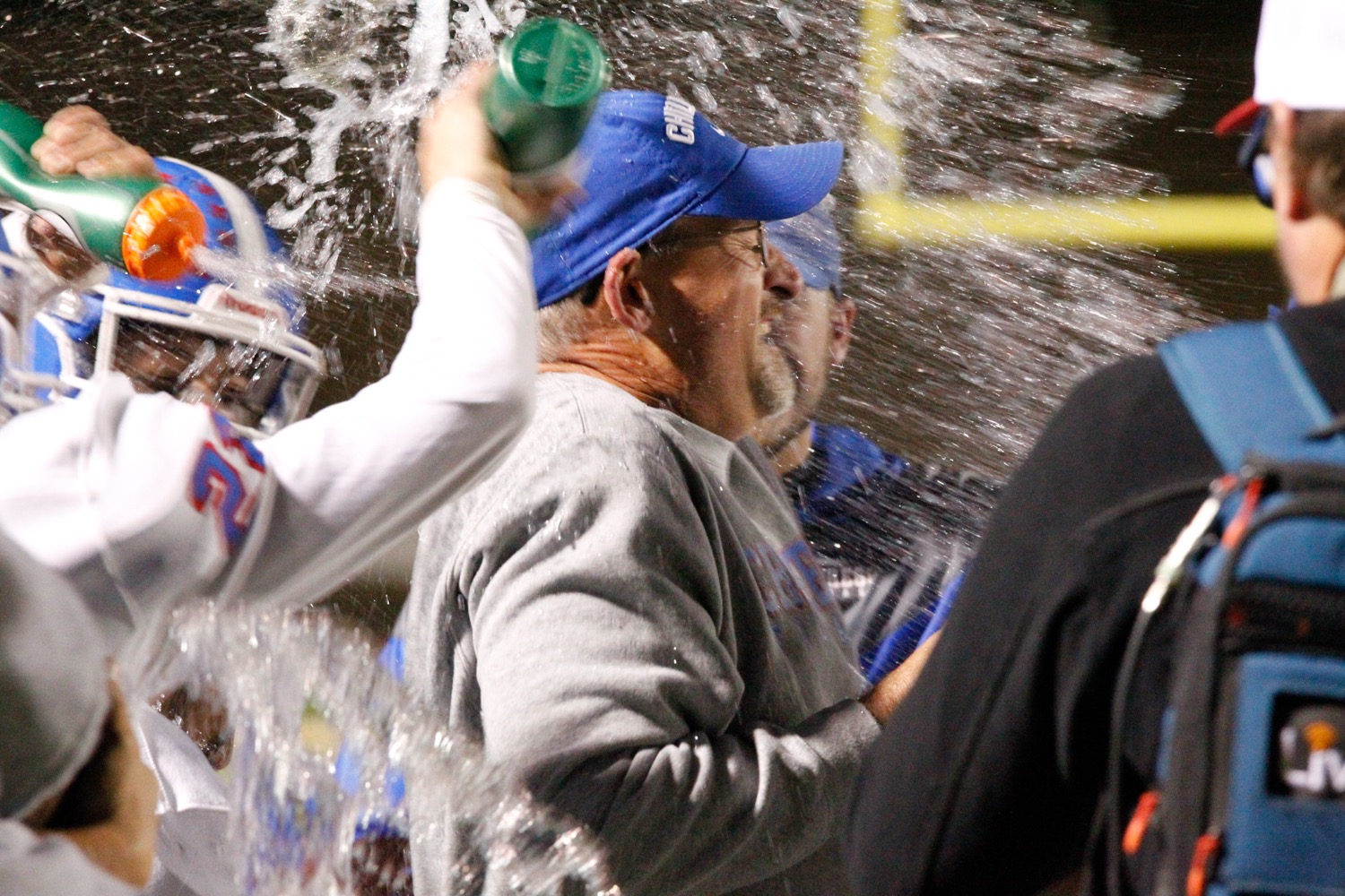 Childress players celebrate head coach Jason Sims after earning his 100th career win during a 34-13 victory against rival Canadian on Friday. [Nicole Dill/ For Press Pass Sports]