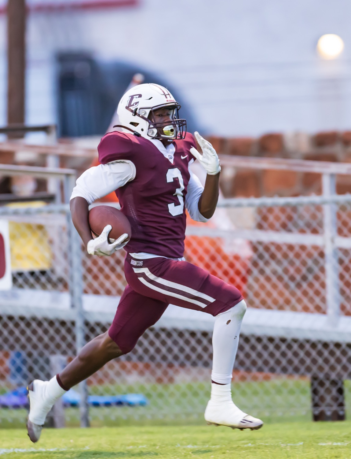 Clarendon running back Jmaury Davis gallops down the sideline in the second quarter during a nondistrict game against Hale Center at Broncos Stadium on Friday. [Tom Carver/ Press Pass Sports]