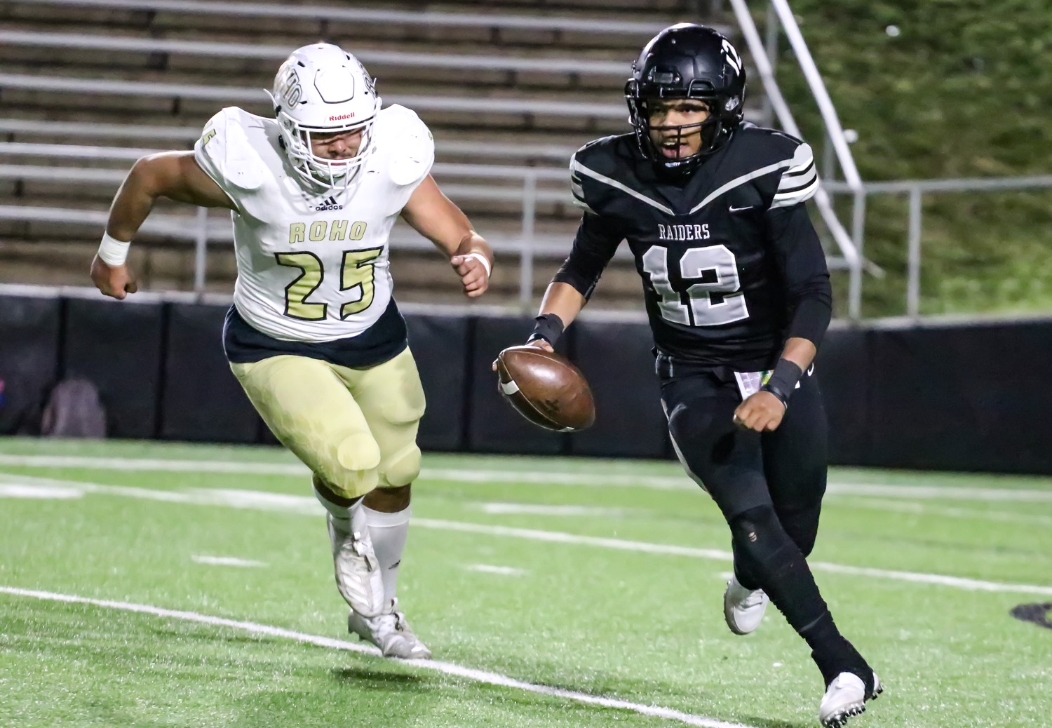 Randall quarterback JaKobe Norman scrambles away from a Wichita Falls Rider defender on Friday night at Kimbrough Stadium. [Ben Jenkins/ Press Pass Sports]