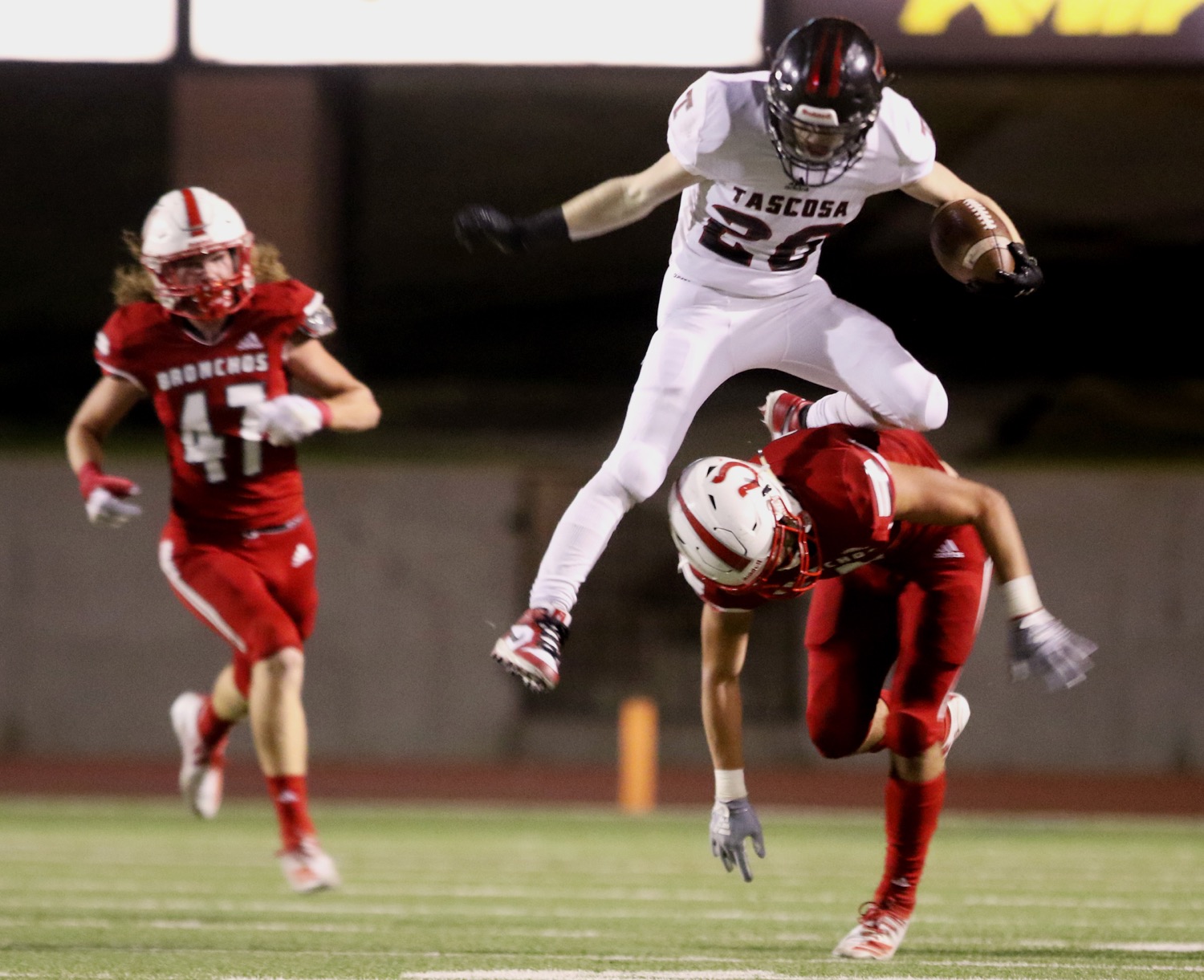 Tascosa’s Logan Nance (26) hurdles an Odessa High defender during a District 2-6A game against the Bronchos on Friday night. [Ben Powell/ Odessa American]