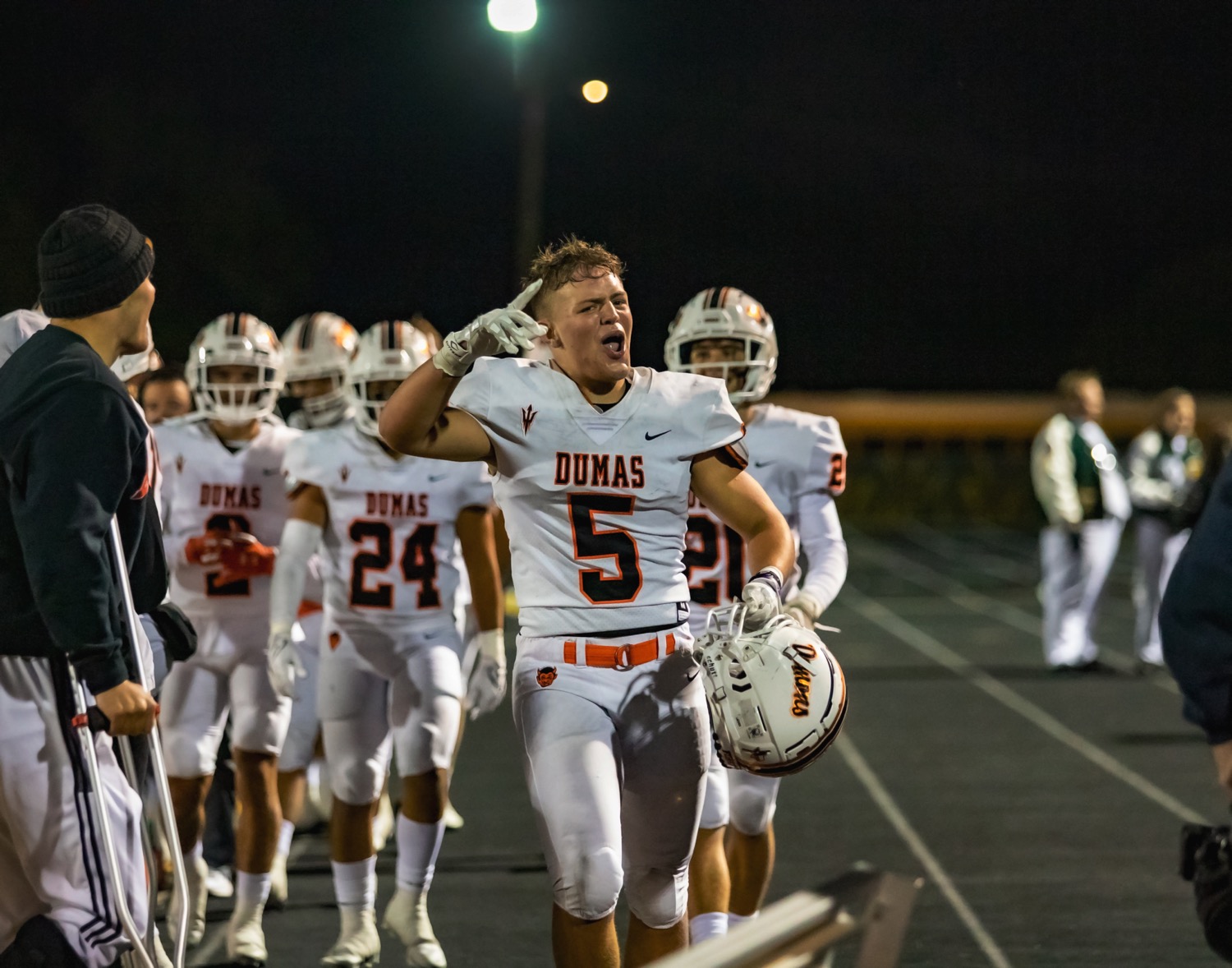The game fairly typified how Dumas has dominated the district, regardless of who the other teams have been. There was a balanced offensive attack and a defense which made plays when it counted and bounced back after some setbacks.