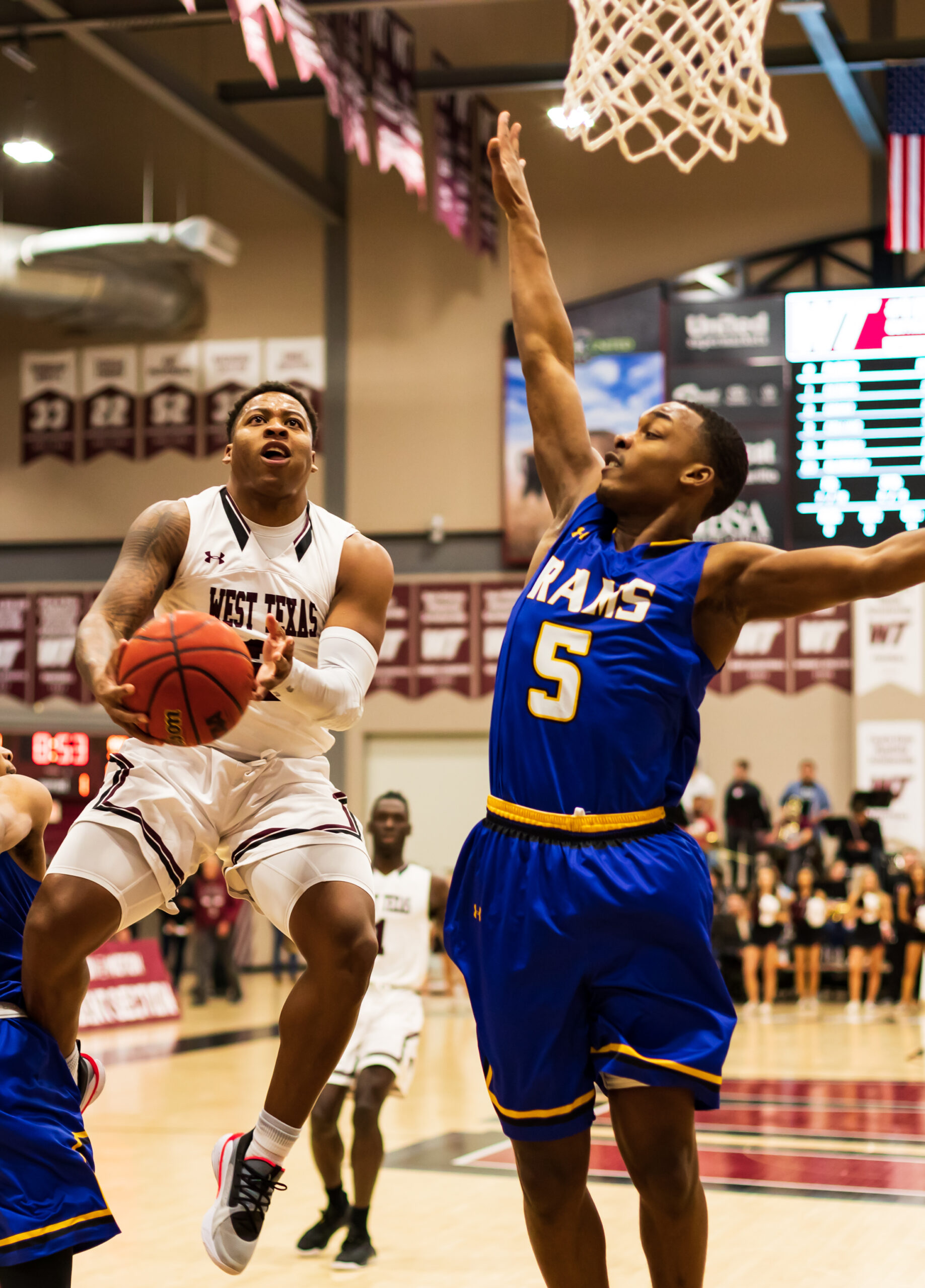 West Texas A&M guard Qua Grant goes up for a lay-in over Angelo State’s Burone Edwards during a Lone Star Conference game Thursday night at the First United Bank Center. [Tom Carver/ Press Pass Sports]