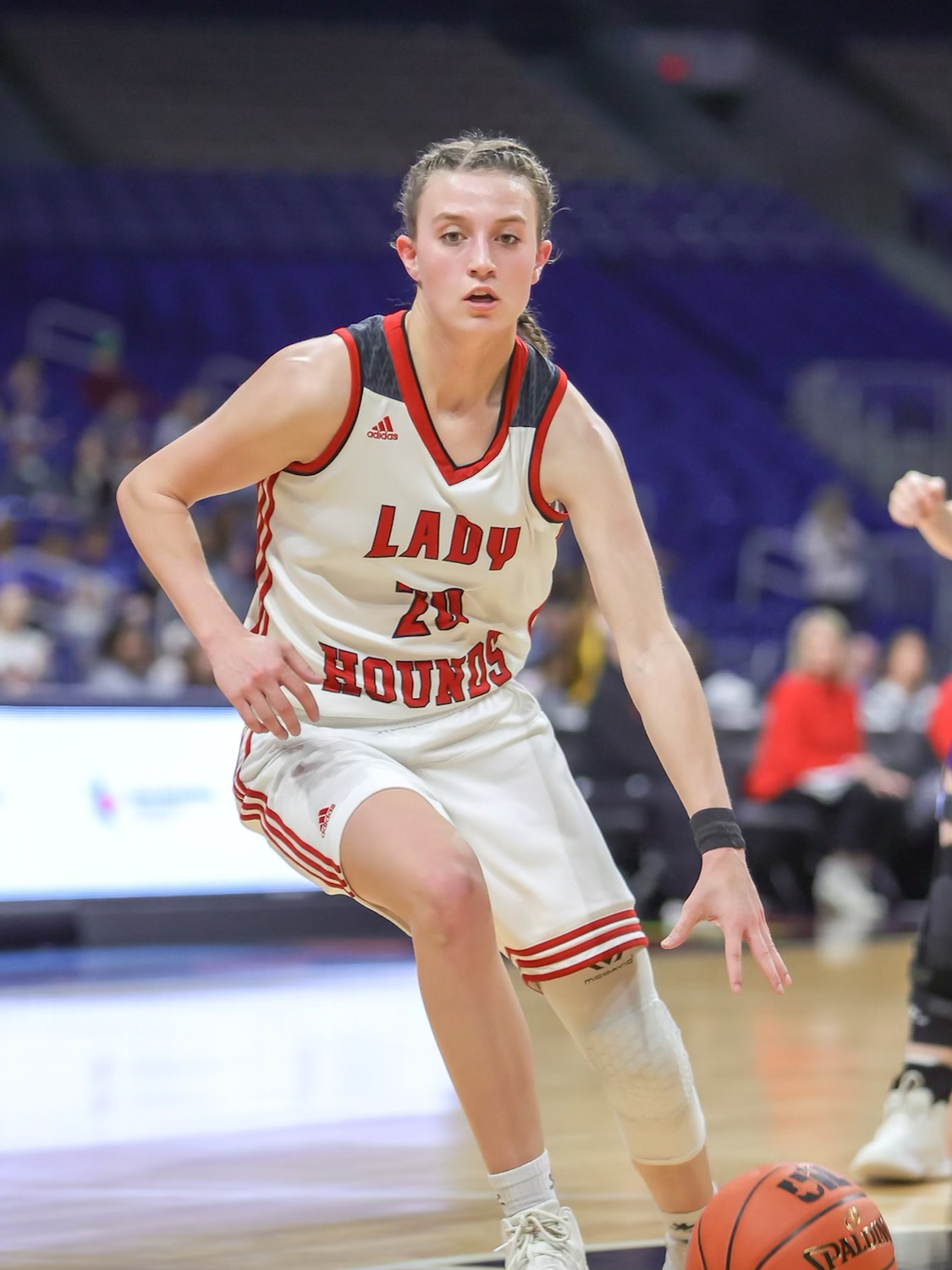 Gruver’s Bailey Maupin scored 18 of her game-high 22 points in the second quarter to lead the No. Lady Hounds past San Saba 69-29 in a UIL Class 2A state semifinal on Friday at San Antonio’s Alamodome. [David Olmos/ For Press Pass Sports]