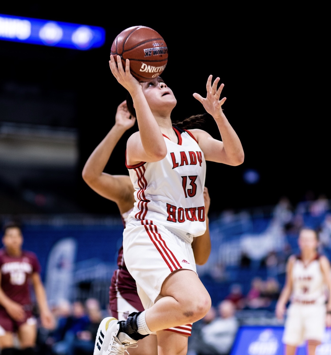 Gruver’s Andi Salgado goes in for a layup during the Lady Hounds 59-49 win against Grapeland in a UIL Class 2A semifinal at the Alamodome in San Antonio. [Matt Smith/ For Press Pass Sports]
