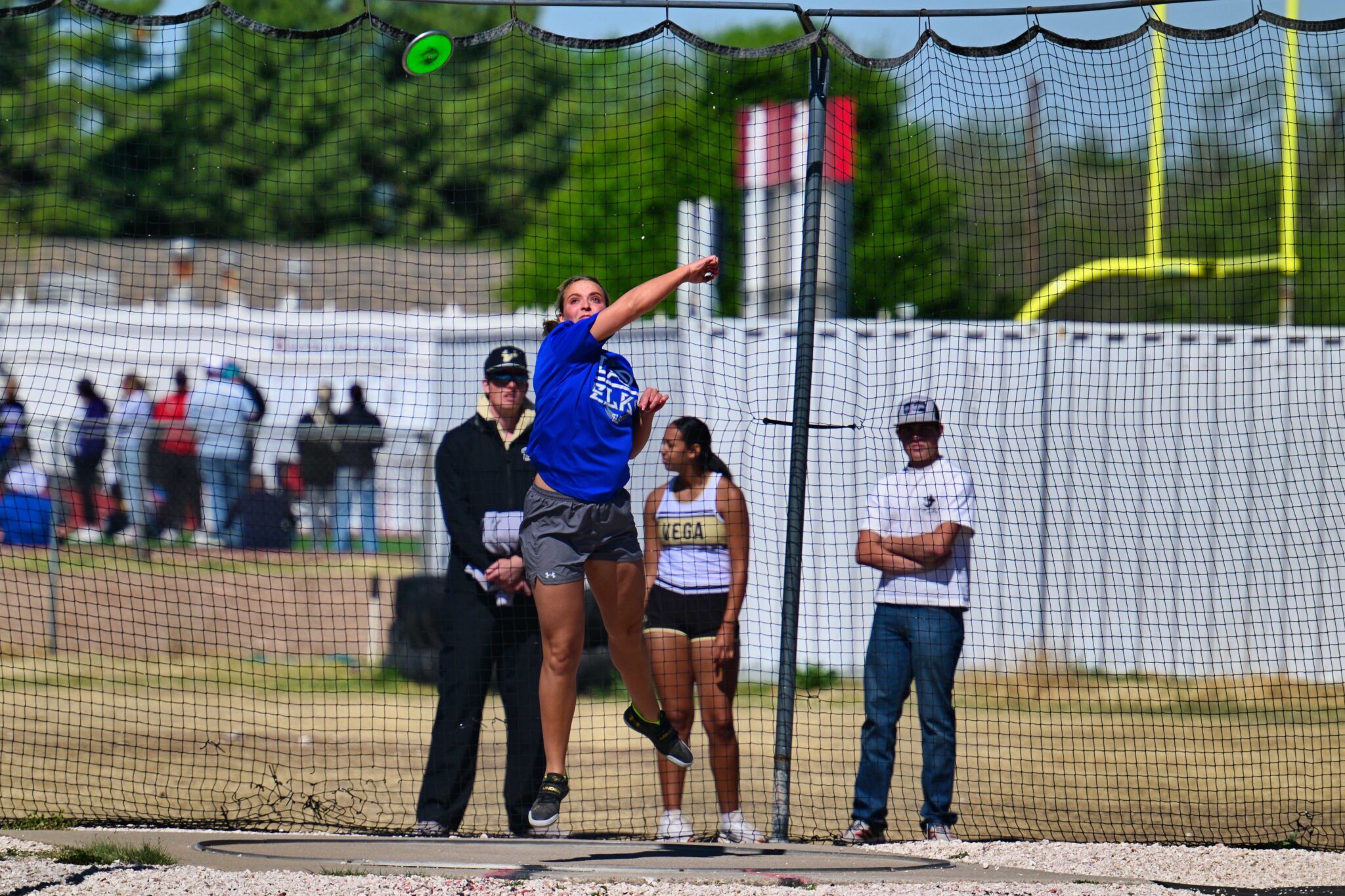 Halle McLain went double gold. McLain started her meet by clearing 11-feet for a gold in the pole vault. In the running event, McLain was able to get back on the gold medal podium with a victory in the 800-meter run pacing the field with a time of 2:35.52. Marlee Maupin was stellar in the long distance events for Gruver. Maupin won a gold in the 1600-meter race clocking a 6:04.37, and also won the 3200-meter run outlasting everyone with a time of 13:31.01. Freshman Payton Merkel will head to area in three events. Merkel popped off a 17-4 to win the long jump and earned bronze in the triple jump (34-2 1/4). Merkel was then part of the Lady Hounds gold medal sprint relay team that ran a 50.94, and 800-meter relay (1:51.86), and anchored the mile relay squad to a silver (4:13.12).