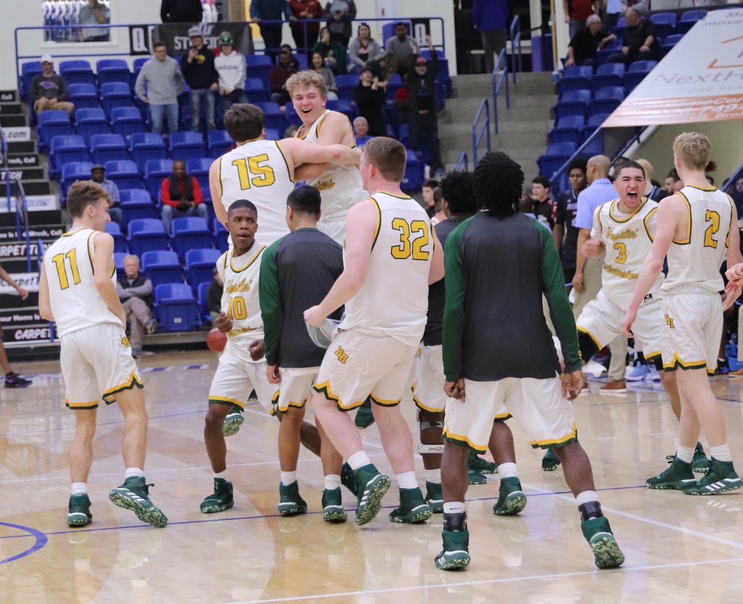 The Pampa Harvesters celebrate after defeating Wichita Falls Hirschi 45-41 in a Region I-4A semifinal Friday night at the Rip Griffin Center in Lubbock. [Charla Schults/ For Press Pass Sports]