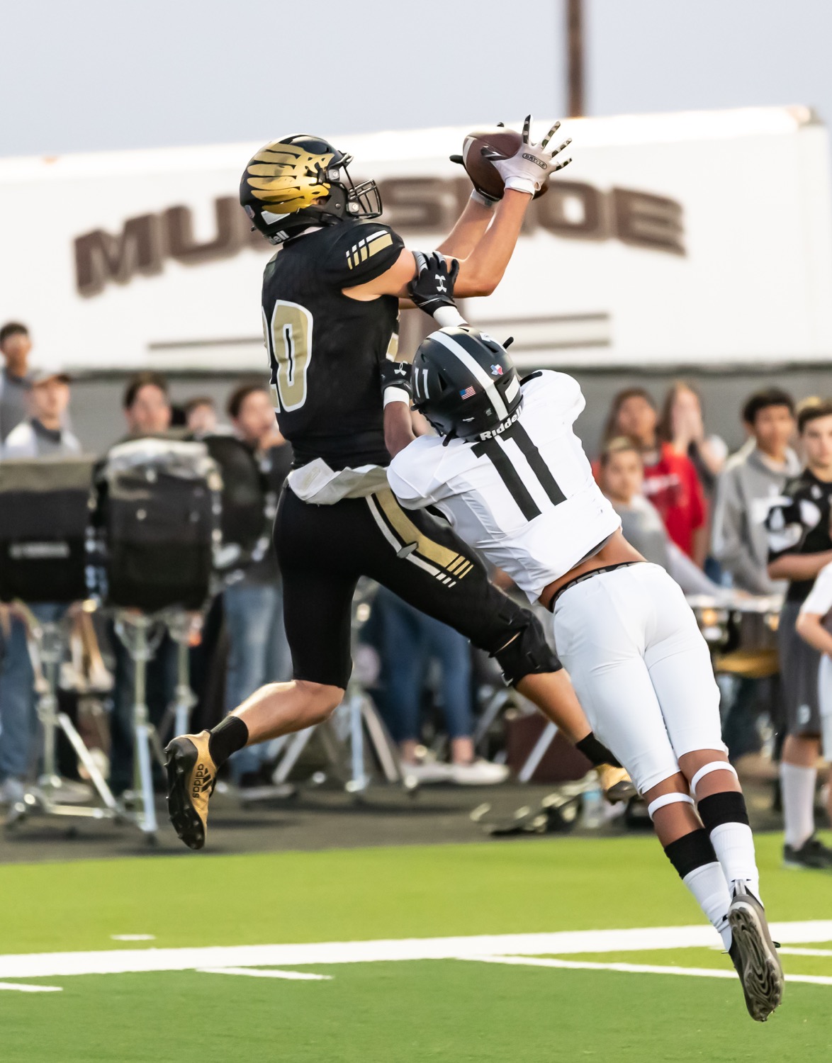 Bushland receiver Brody Sutterfield makes a catch over a Muleshoe defender during a District 2-3A Division I game last Friday. [Tom Carver/ Press Pass Sports]