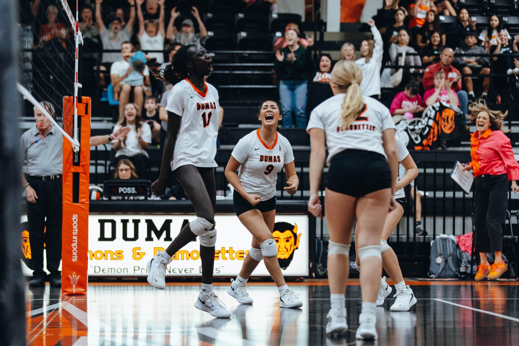 In a match where it came down to the final two points, the Dumas Demonettes were able to hold off Hereford and defend home court in a thrilling five-set match getting the win, 21-25, 25-22, 25-17, 23-25, 16-14, on Saturday in a key District 4-4A clash.