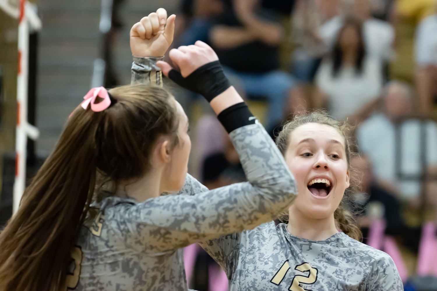 Amarillo High’s Ella Krusa (12) and teammate Currie Marusak celebrate during the Lady Sandies win against Bell Street rival Randall on Saturday at the AHS Activity Center. [Tom Carver/ Press Pass Sports]