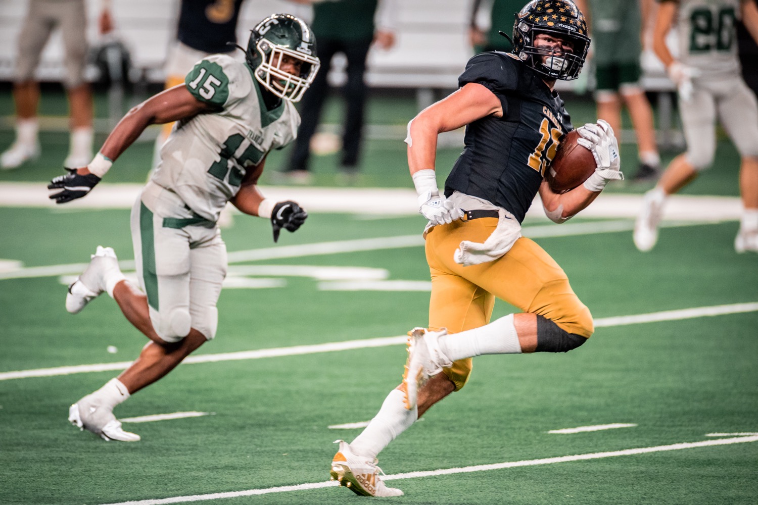 Running back Hayze Hufstedler, playing in his second state title game in the last three years left his imprint on Jerry World. The bruising back left it all on the field one final time plowing his way for 153 yards on 23 carries, including a 47-yard touchdown run.