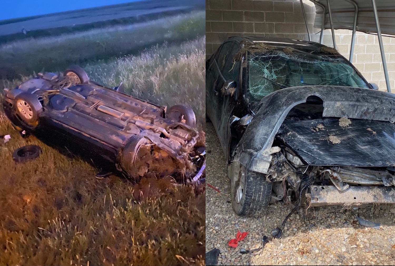 The picture on the left is Weaver’s 2008 Nissan Ultima turned over at the wreck scene in September. The photo on the right was damage to the car. [Provided photo]