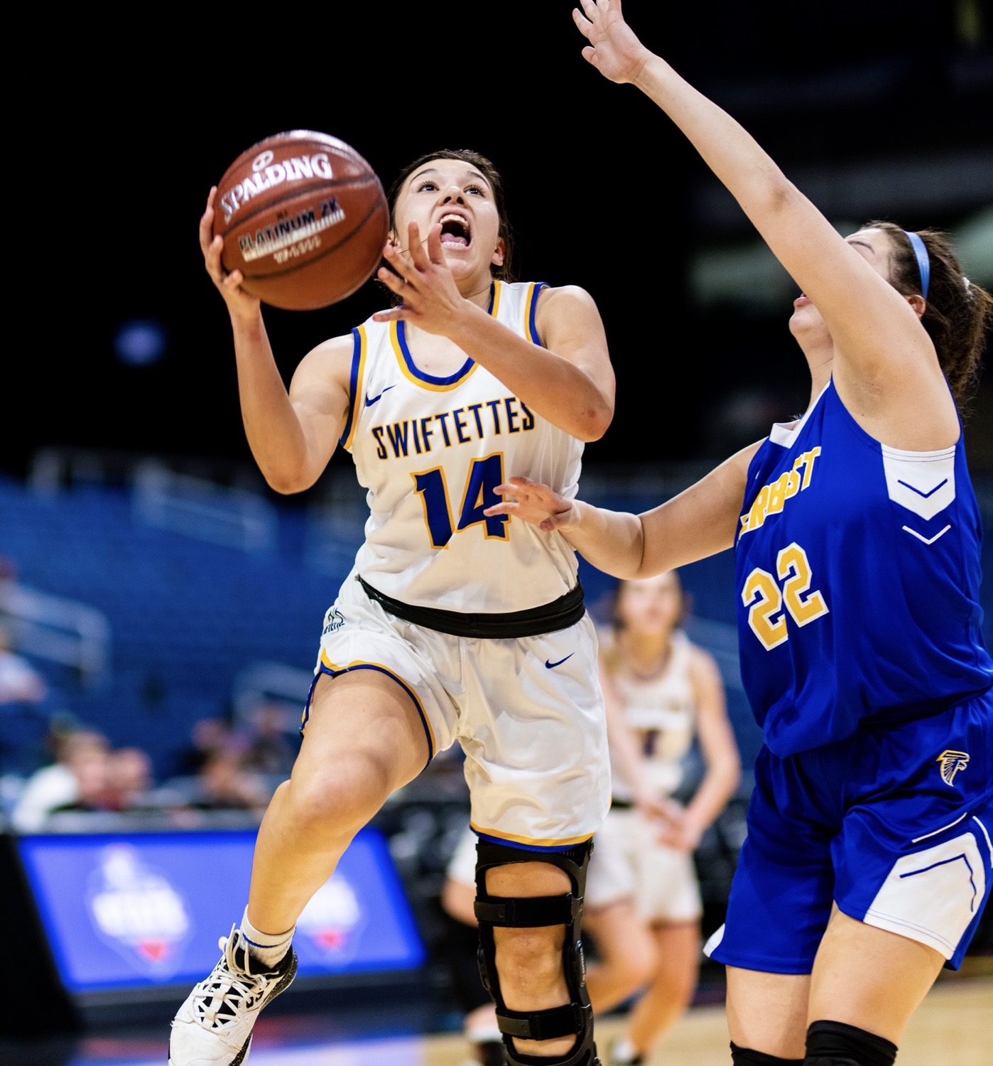 Nazareth’s Mackenzy Corrales (14) goes up for a layin during the Swiftettes 43-23 rout of Veribest during a UIL Class 1A state semifinal Thursday morning at the Alamodome In San Antonio. [Matt Smith/ For Press Pass Sports]
