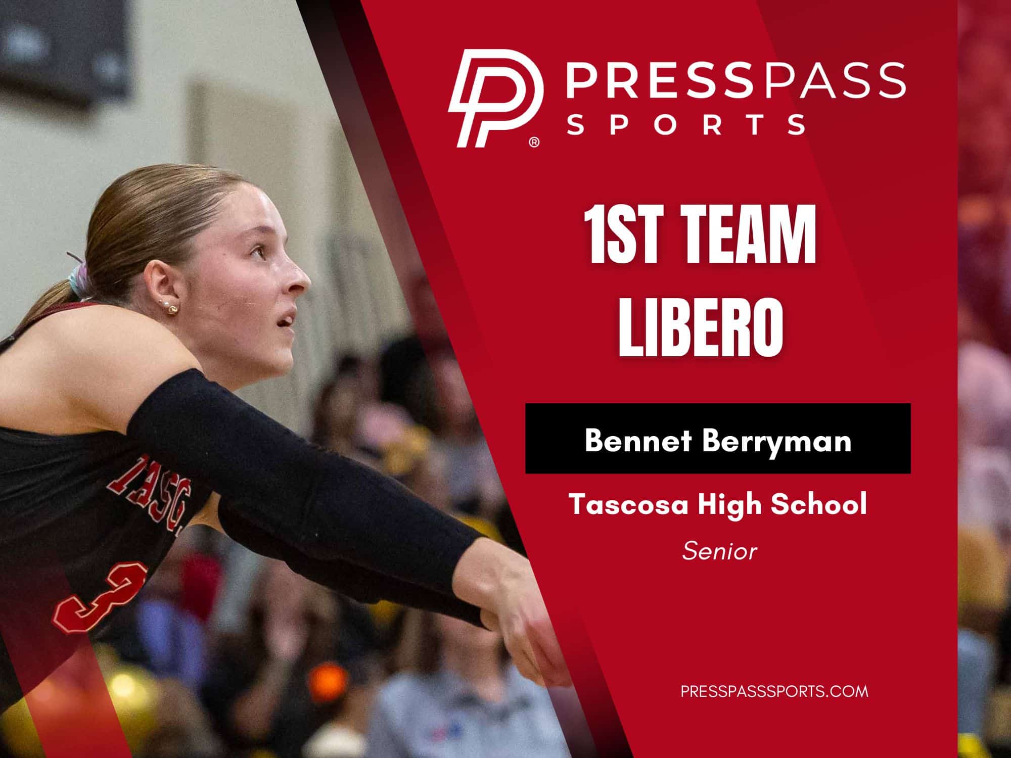 Berryman makes the Press Pass Sports Team for a second year in a row. The leader of the Tascosa Lady Rebels did her job with her defense and that showed by being named the District 3-5A Defensive MVP for a second consecutive season. Berryman, an Oklahoma Christian signee, was all over the court with 656 digs, finishing with over 2,000 career digs over four years.