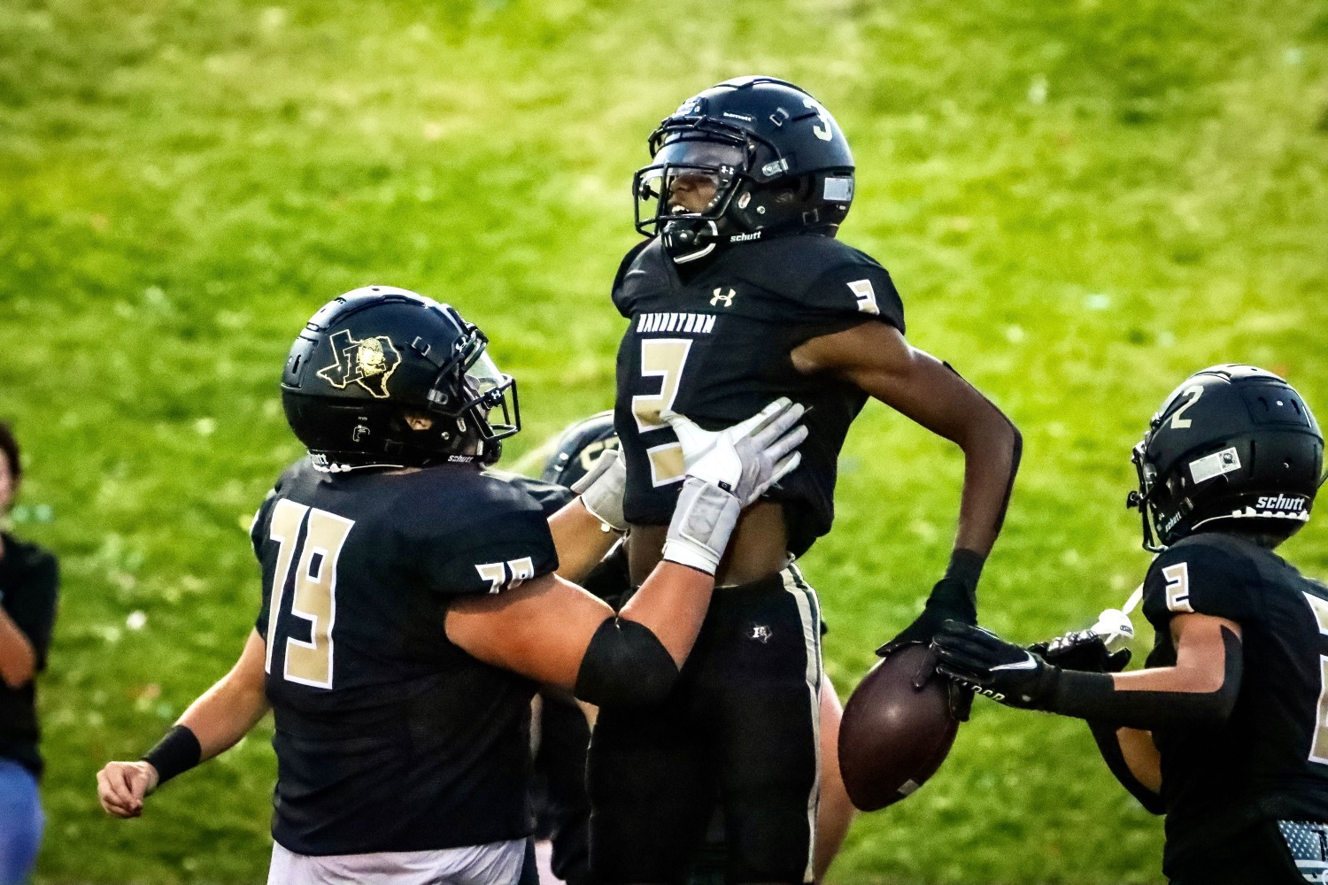 Amarillo High offensive lineman Kaden Carr lifts Tyrese Molden after a touchdown against Frenship at Dick Bivins Stadium on Friday night. [Ben Jenkins/ Press Pass Sports]