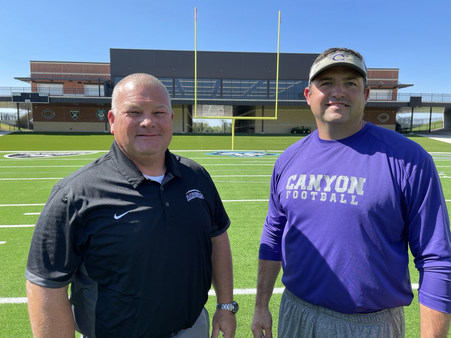 Randall football coach, Gaylon Selman, left, and Canyon coach Todd Winfrey, stand in front of Canyon ISD’s new field house. [Kale Steed/ Press Pass Sports]