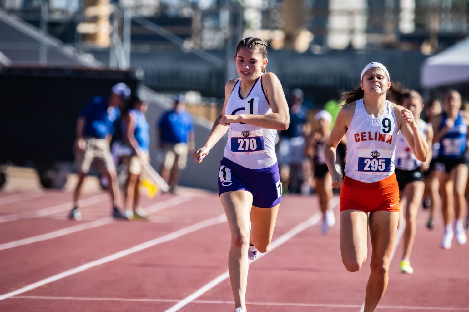 Canyon’s Abree Winfrey, left, crosses the finish to win the 800 meter run during the UIL Class 4A state track and field championships Thursday at Mike A. Myers Stadium. [Ben Jenkins/ Press Pass Sports]AUSTIN— The Canyon girls gave it a great fight but came up just short of Kennedale from repeating as Class 4A champions at the University Interscholastic League state track and field championships Thursday in front of an electric crowd at Mike A. Myers Stadium.